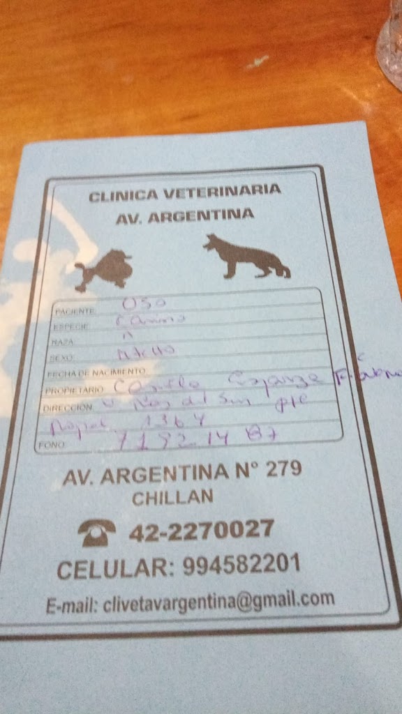 supuesto personal especialisado, no son dignos del oficio una atención médica horrible , un diagnóstico no especificado , una veterinaria con semblante AMENAZANTE no se los recomiendo para nada , estuvo dando medicamento incorrecto a osito y se dio el lujo de citarnos por una inyección diaria , todo por dinero , no tiene vocación , le pedí un historial médico de osito , me entrego un historial horrible cero profesionalidad Le confíe la vida de osito y lo termino matando hoy si en la mañana lo llevamos con la intención de que lo sanará , pasaron dos horas y me llama diciendo que falleció por ponerle un suero para hidratarlo , cuidado gente no se confíen de esta clínica Ayuden den sus testimonios , nosotros teníamos la fe y confiamos en ellos de que tendríamos nuestro primer cachorro sano , que lo podría sanar pero no lo hiso , lo dejo morir y me atrevo a decir que con su medicación y pésimo diagnóstico ella mato a OSITO!! CERANEA DURANTE 4 DIAS LE INYECTO GORBAN 2 INYECCIONES GASTRONTERIL Y DIPRAMIDA diagnóstico de ella Gastroenteritis Osito estaba desidratado Vomitaba No comía ni bebía agua No lo hidrato en un comienzo no dió una especificación de cuál fue la cantidad de medicamentos que utilizo , tuve que pedirle el suero para saber si se lo había dado , porque supuestamente murió en el momento de darle el suero , me lo trajo el suero estaba nuevo , me devolvió el dinero , pero el dinero no me interesa a mí me interesaba que osito viviera y sanará y esta supuesta profesional me lo matoo , y junto con su asistente se defienden.. BOTARON EL SUERO CON ACTITUD VIOLENTA A LA BASURA Y NO ME DEJARON SACARLE FOTOS AL SUERO Solo pido Gente no lleven a sus animalitos a dónde esta clínica asesina , investiguen lean y luego opten por un veterinario CLINICA CHILLAN AV.ARGENTINA LTDA.. UNA CLINICA SIN VOCACION. POR FAVOR GENTE NO COMETAN EL MISMO ERROR QUE NOSOTROS , HOY ESTAMOS SUFRIENDO POR HABER ENTRADO AH ESA CLINICA INCOMPETENTE Y CON UN PESIMO PERSONAL... Con decirles que la secretaria ni imprimir sabía PESIMO SERVICIO PESIMA ATENCION PESIMO CUIDADO A LOS ANIMALES NO TIENEN VOCACION MUCHOS OPTAMOS POR ADOPTAR UN CACHORRO Y ESTA CLINICA LOS MATA Me lo entregaron en una bolsa de basura , que impotencia, y amenaza que si la demando ella pondrá su abogado CUIDADO GENTE PORFAVOR NO MAS CLINICAS COMO ESTAS , MAS GENTE CON VOCACION